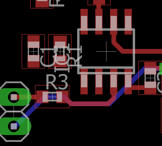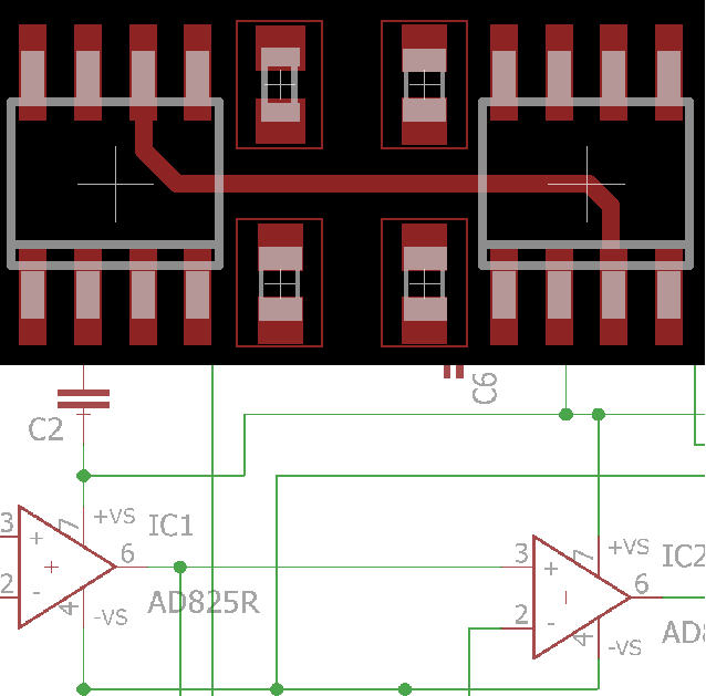 Kaip pasiekti gerų EMC savybių turintį išdėstymą? Visų pirma, didelės varžos įėjimų laidai (paveikslėlyje – jungtis su operacinio stiprintuvo /- įėjimu) turėtų būti kuo trumpesni! Apskritai signalo keliai į įėjimus turėtų būti kuo trumpesni, o signalo keliai iš išėjimų – kuo ilgesni.